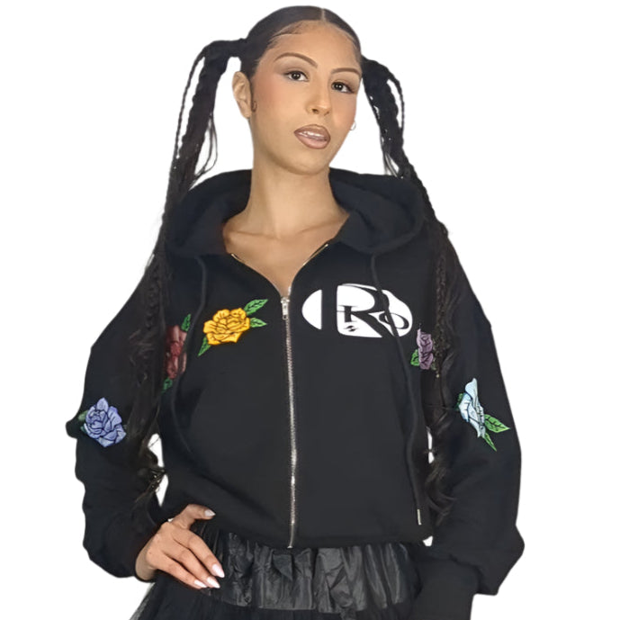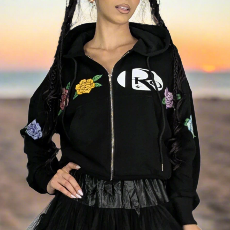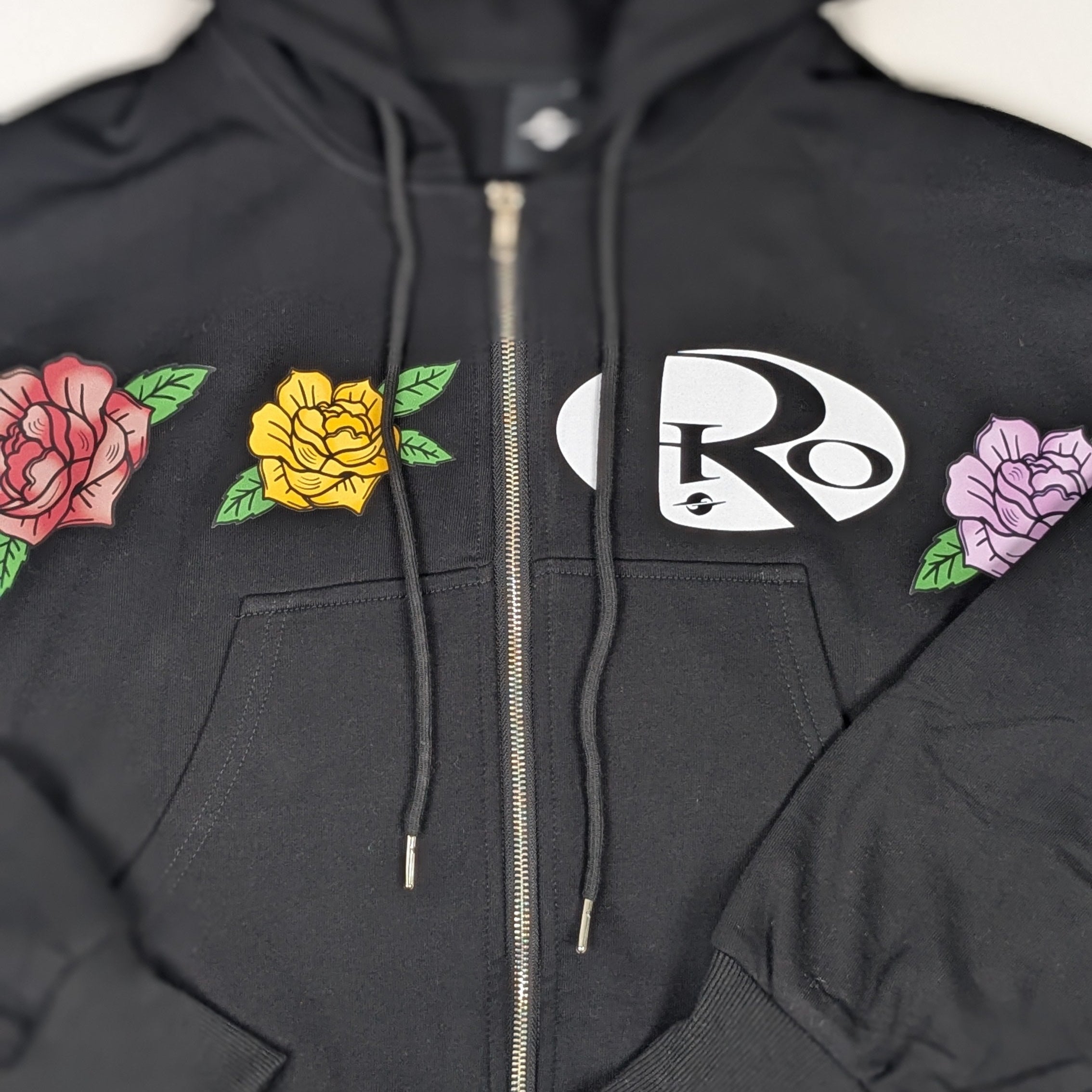 This plush French Terry sweater comes with a front zipper and a big, cozy hood. It features 2 front pockets, ribbed cuffs and stretchy hem for a snug fit. The drawstrings match the fabric and have cool metal tips. Colorful tattoo-style roses decorate the front and back, with a black ELLIPSE logo printed on the chest. This is a standout out piece.