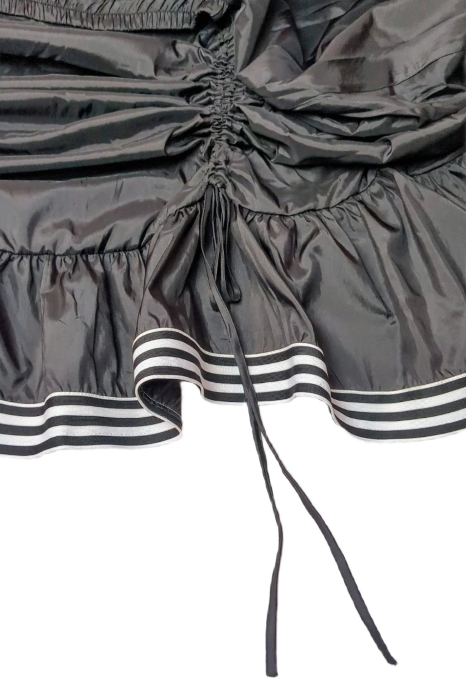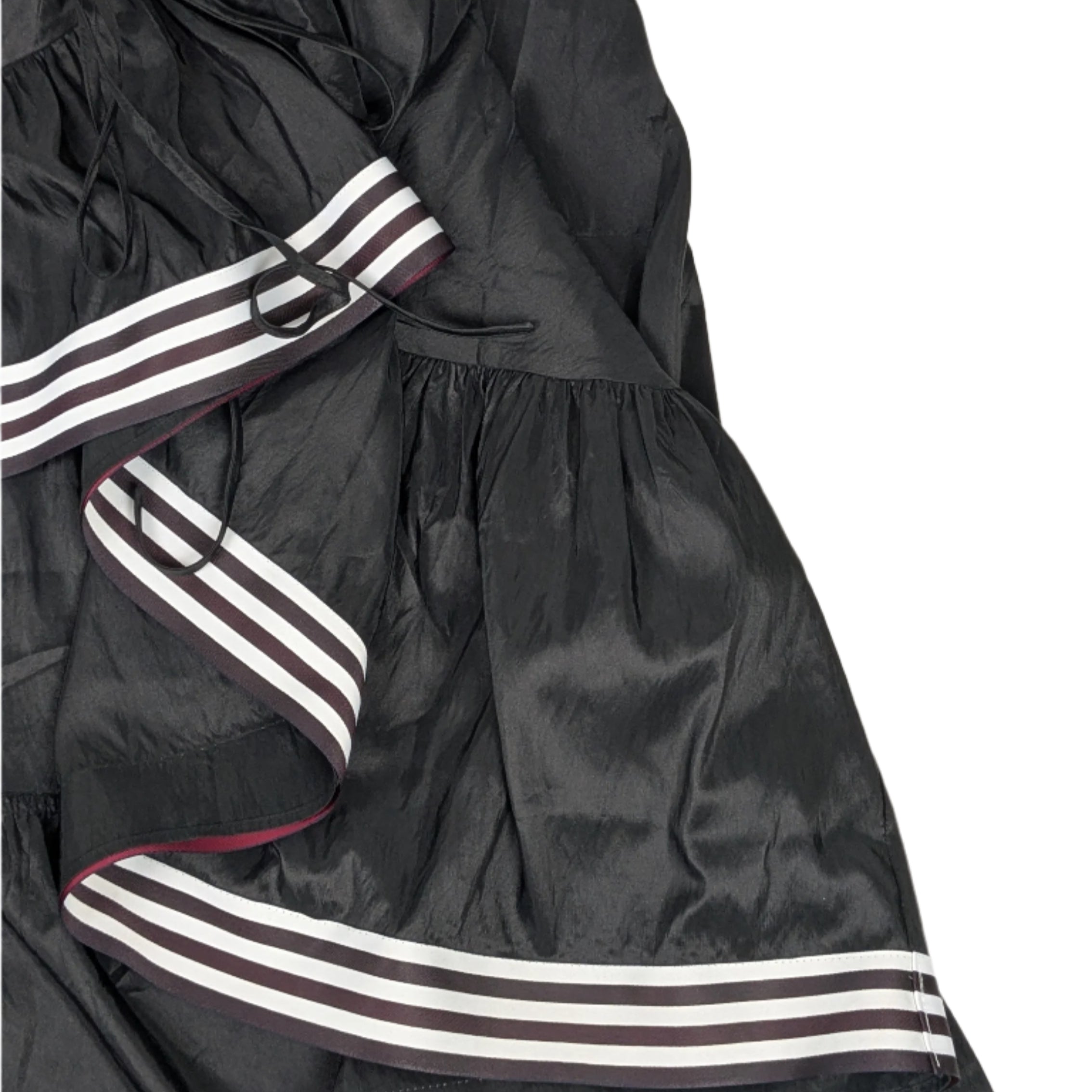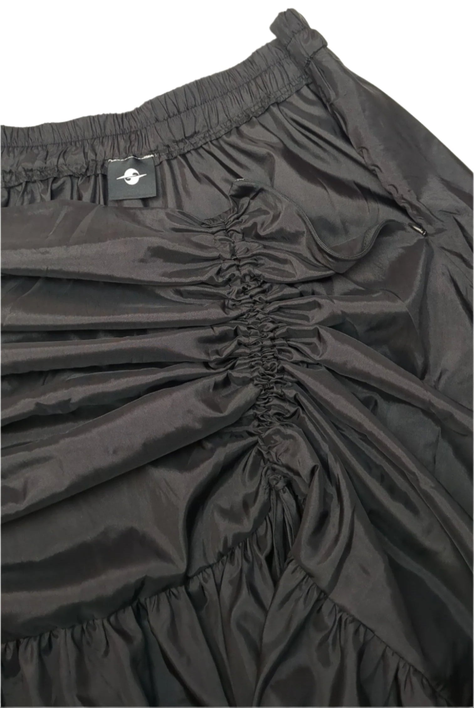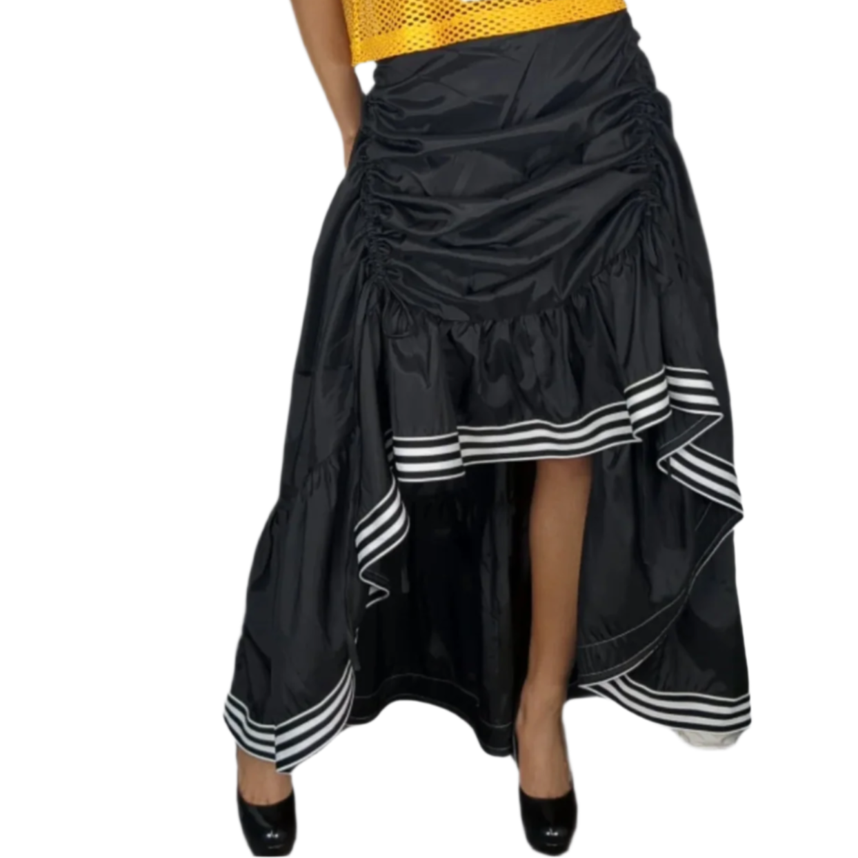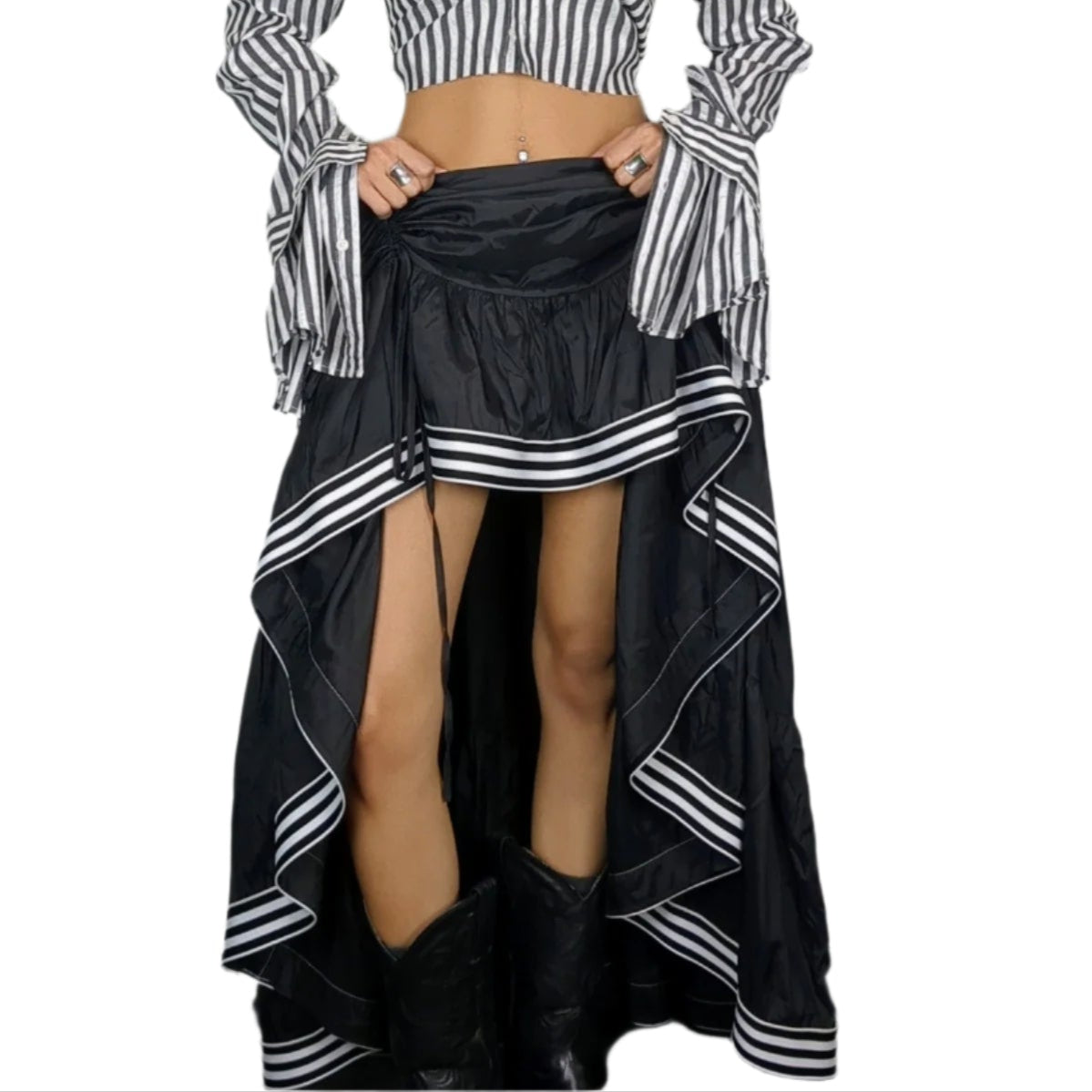 This vMEDIEVAL INSPIRED skirt features 2 drawstrings, so you can play with the length to match your mood. Crispy taffeta fabric has an iridescent sheen. Comfy elastic waistband with zipper. Ruffled hemline has eye-catching stripes all along the bottom.