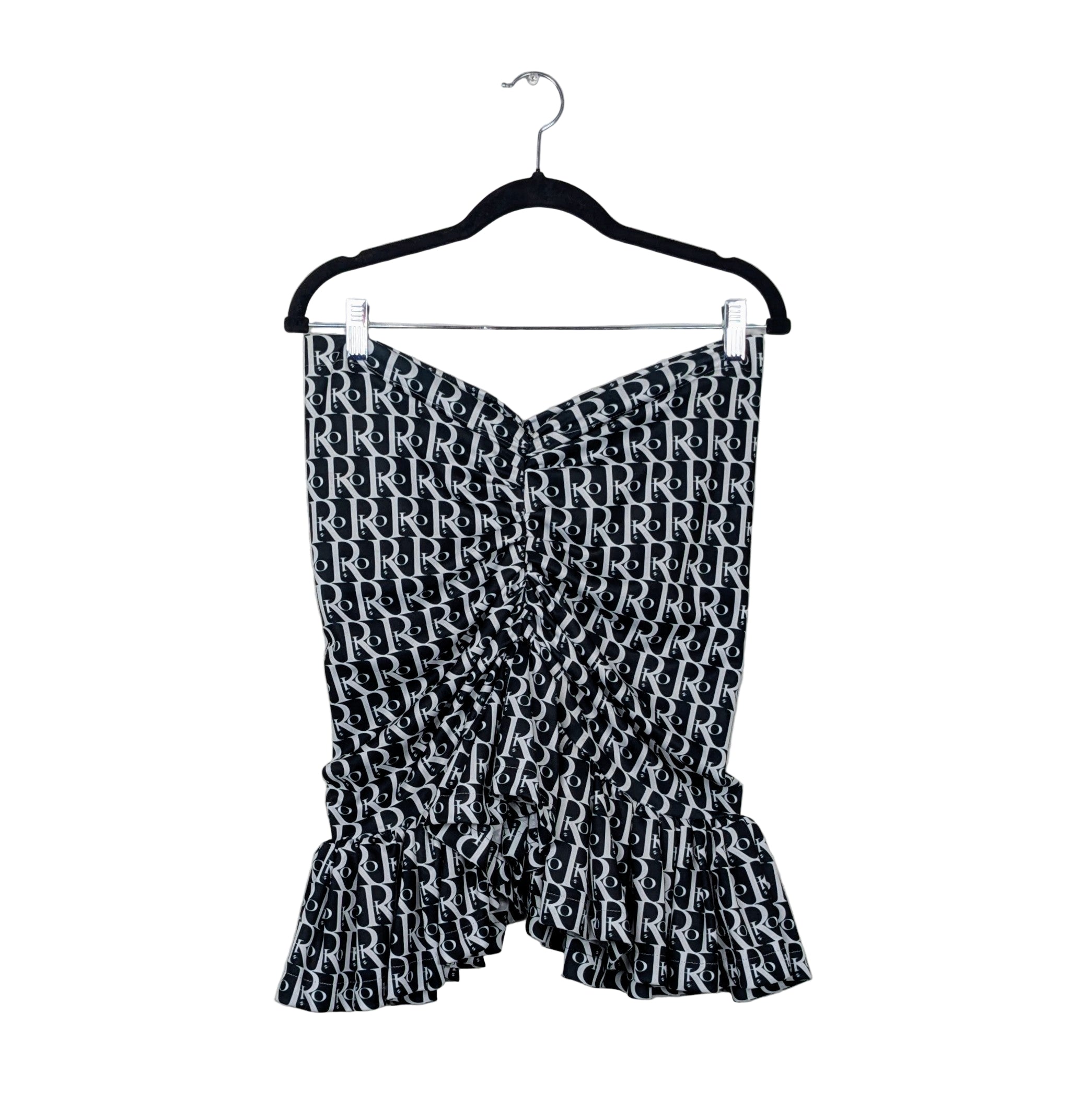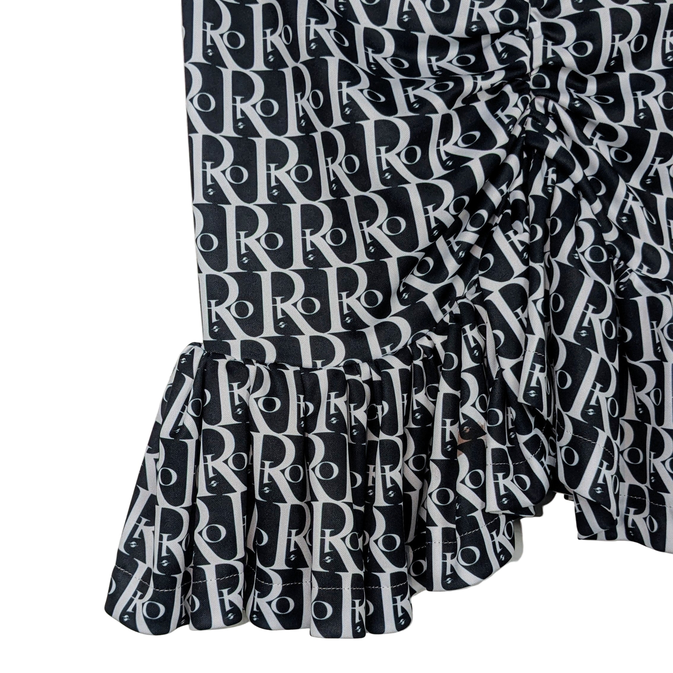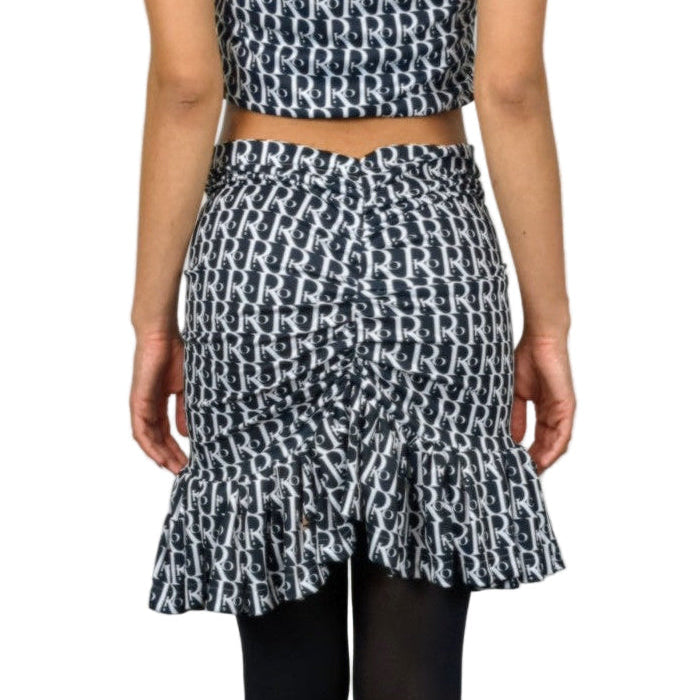 The Spring/Summer 2026 ruched skirt is crafted from a soft and stretchy fabric with an elegant sheen. OBLIQUE print in black and white adds a touch of elegance. Flirty ruffles all along the hemline. Versatile enough for day-to-night adventures.