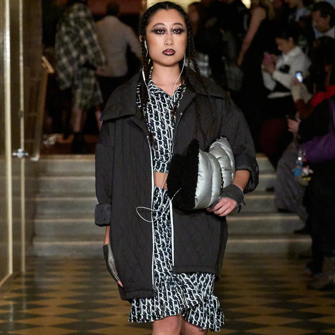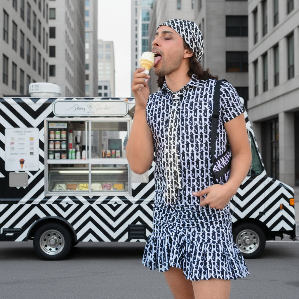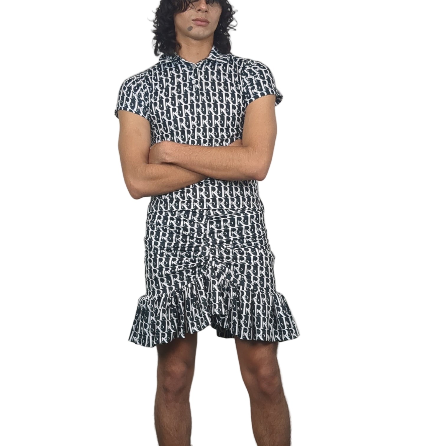 The Spring/Summer 2026 ruched skirt is crafted from a soft and stretchy fabric with an elegant sheen. OBLIQUE print in black and white adds a touch of elegance. Flirty ruffles all along the hemline. Versatile enough for day-to-night adventures.