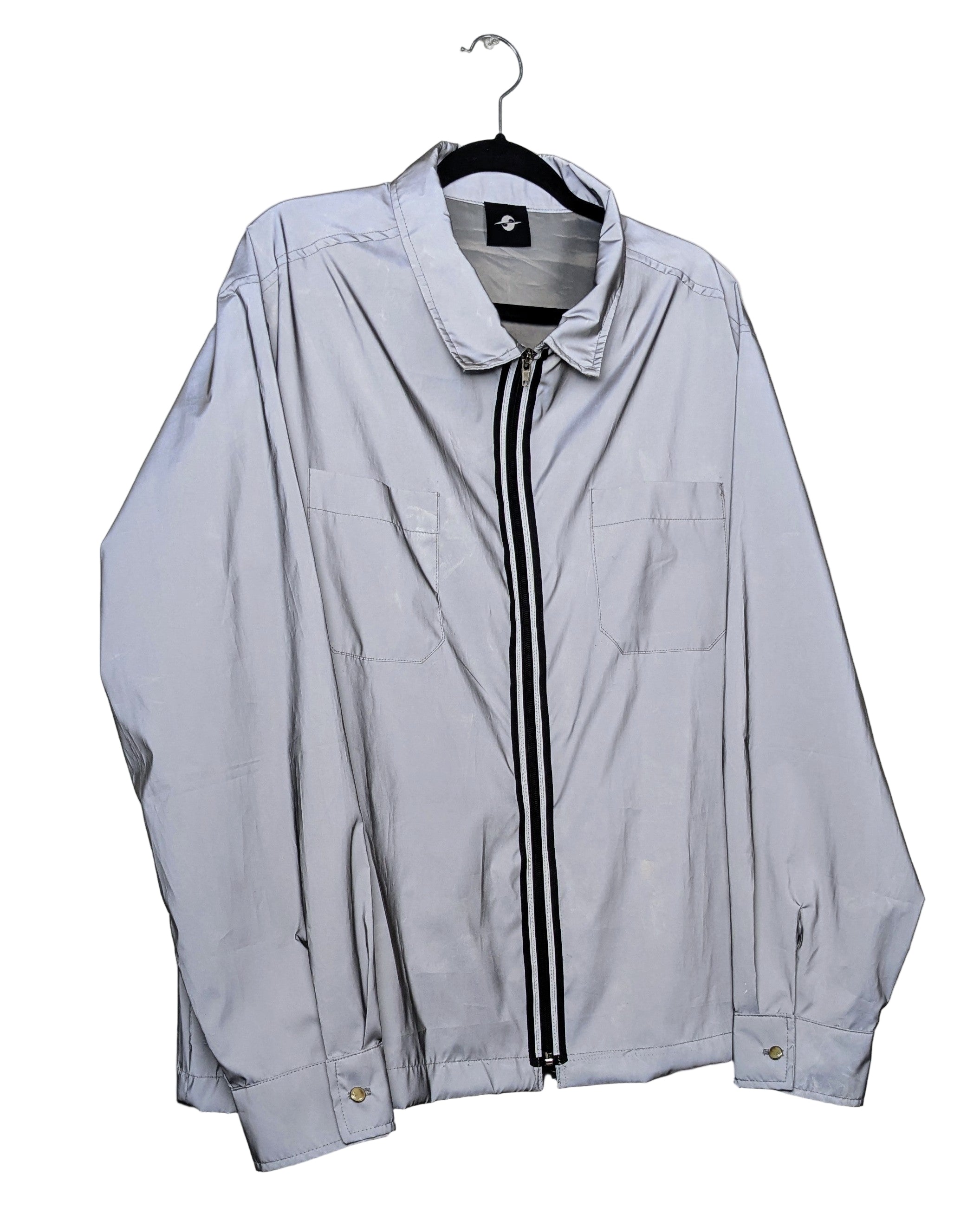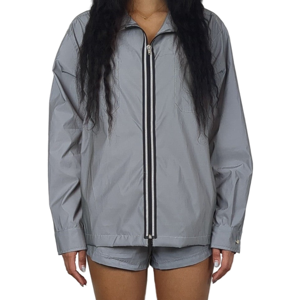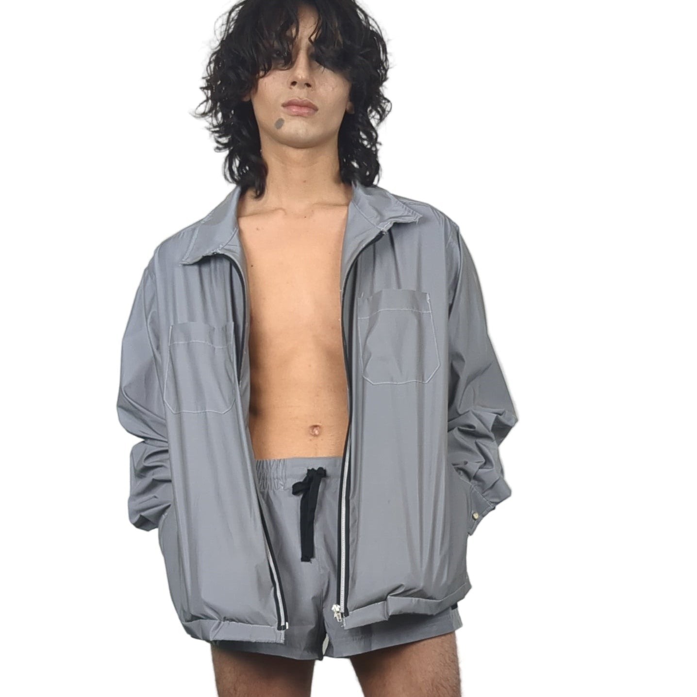 This Spring/summer 2026 windbreaker is crafted from a luminescent nylon with a 3M zipper. Matte grey shell is coated with a 3M reflective finish that glows when exposed to light. Turn heads in this high-visibility all-weather essential.