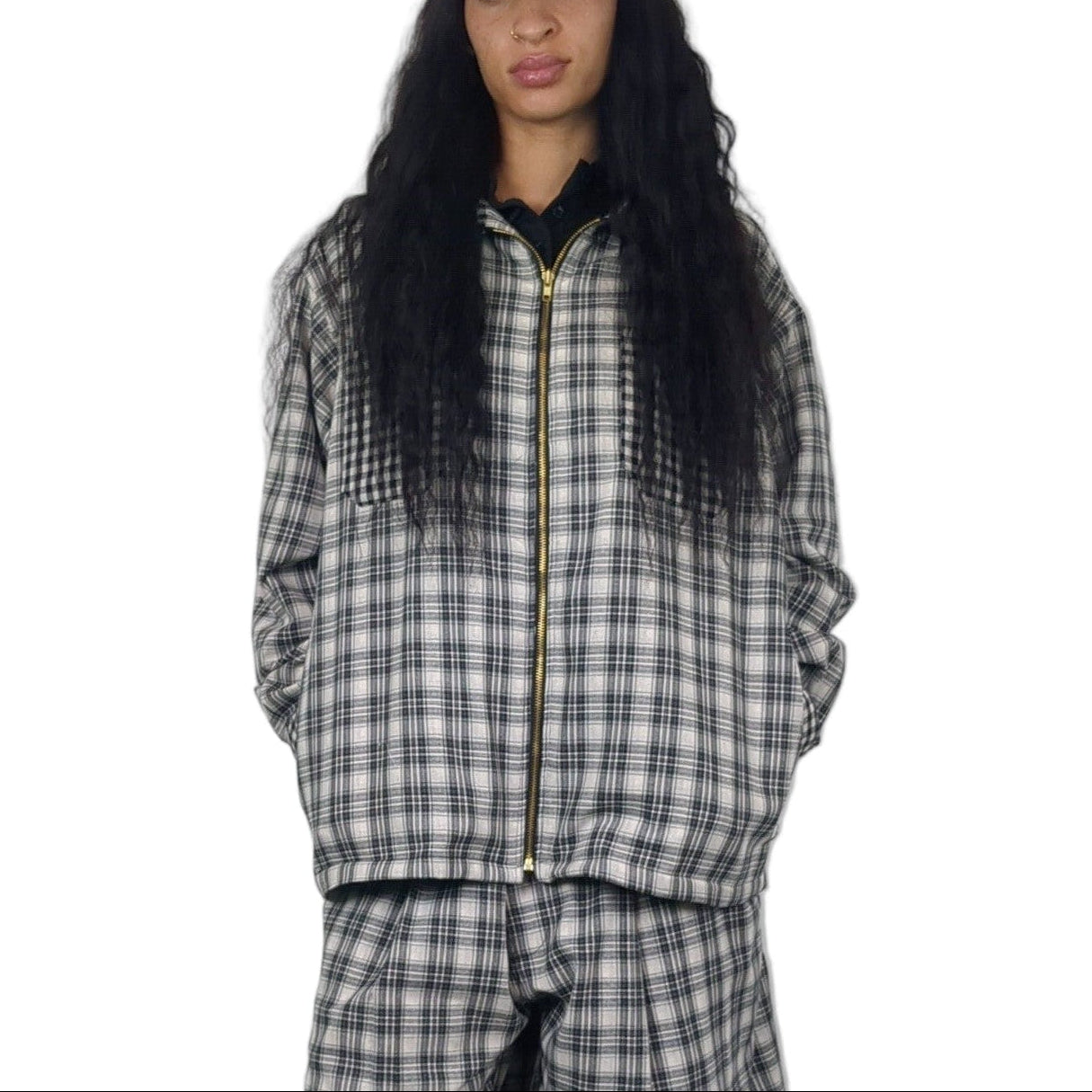 This Spring/summer 2026 windbreaker is crafted from a light weight cotton and linen blend. The black and grey tartan design is a classic from the hood to the high street. Gingham collar, cuffs, and 2 front pockets add some contrast to the design. 2 more pockets built into the side seams. Self-lined.
