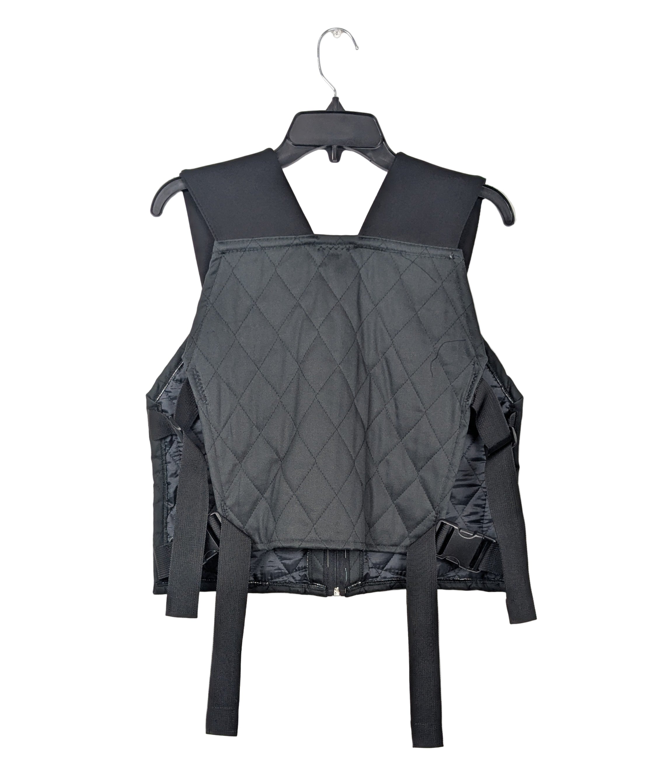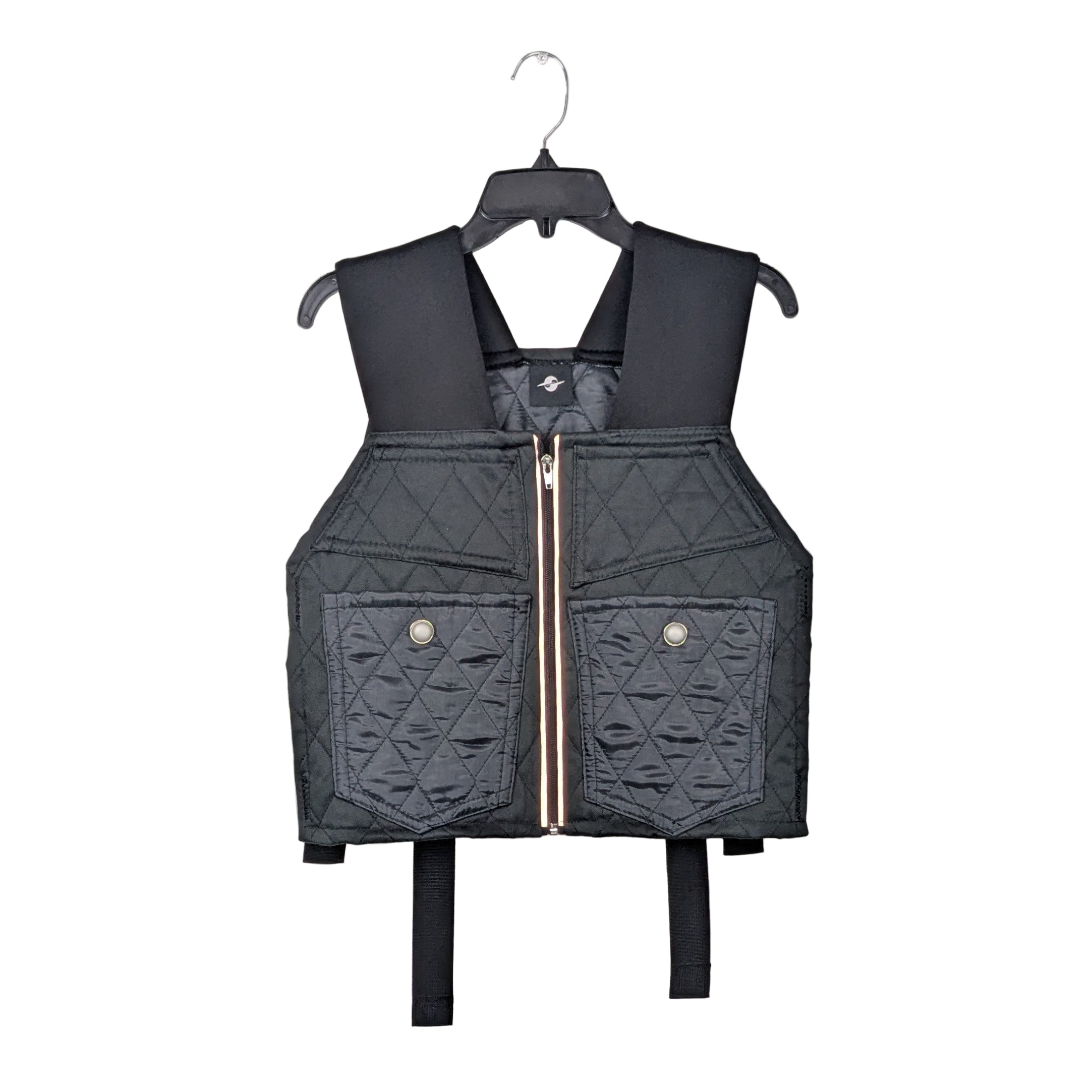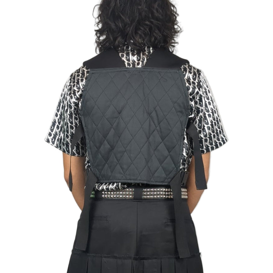 The Spring/summer 2026 Utility Vest is crafted from a heavy black nylon in a quilted diamond design. Adjustable web belts on both sides. Neoprene shoulder straps for comfort. Reflective zipper. Self lined.